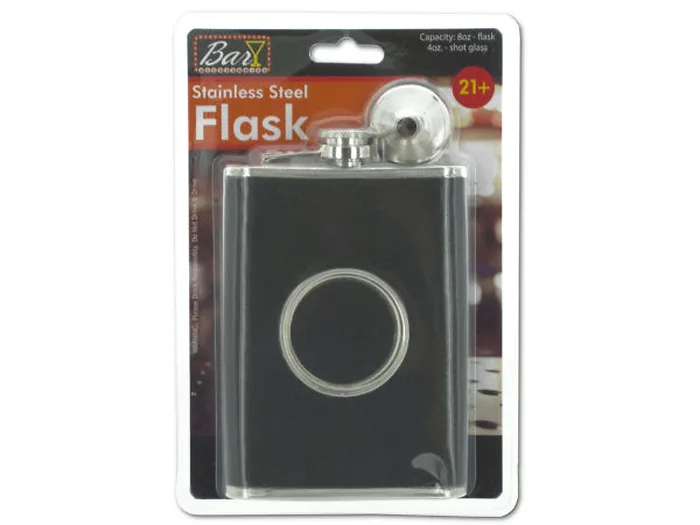 Easily sip and pour drinks with this 3-piece Stainless Steel Flask Set featuring an attractive set that provides sleek, sturdy containment for transporting and serving your spirit of choice. Set includes a steel flask with a faux leather covering, a small funnel and a collapsible shot glass. Flask holds approximately 8 ounces and shot glass holds approximately 4 ounces. Flask measures approximately 4" x 5.75". Comes in assorted colors: black and turquoise. Comes packaged in a blister pack.