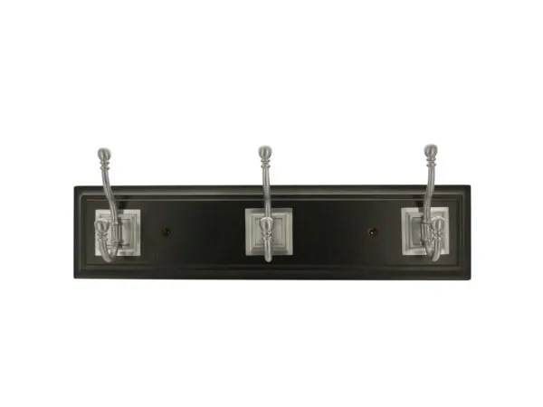 Add a touch of elegance to your home with the Liberty Black Rail, which features a deep black finish and three satin nickel pilltop hooks. This wood rail is perfect for organizing a variety of items such as coats, hats, handbags, umbrellas, towels, or robes. Its classic design complements any room, from the entryway to the bathroom.