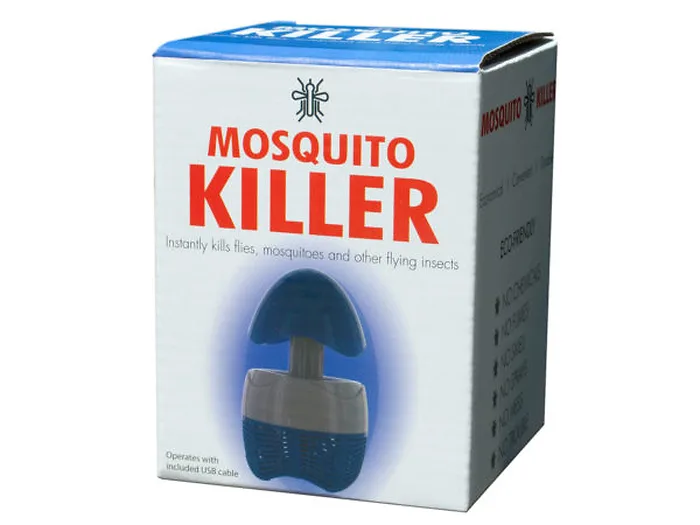 Instantly kill flies, mosquitoes and other flying insects with this Egg-Shaped USB Mosquito Killer featuring a compact bug zapper designed with blue LED lights and a fan with a container that will capture insects. It is much more efficient for insect control than traditional insect killers and does not use harsh chemicals or an electric shock. Insects are sucked into the bottom container and killed by the fan. Instructions included. Comes in assorted colors: pink and blue. Measures approximately 4.75" tall x 3" in diameter. USB cable included. Comes packaged in an individual box. Box measures approximately 3.75" x 3.75" x 4.875".