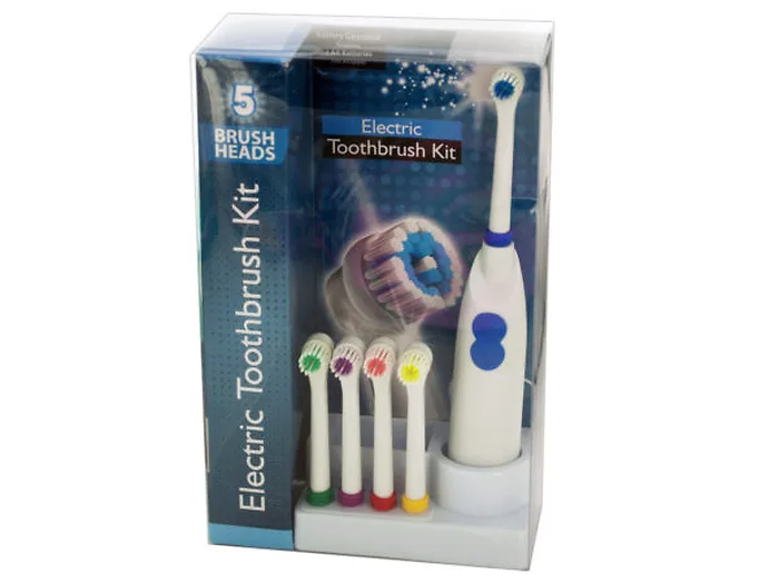Includes toothbrush, 5 brush heads and a convenient organizing storage caddyBatteries not includedRequires two 'AA' batteriesGreat for travel and everyday use, this electric toothbrush set is perfect for all agesElectric toothbrush in an ergonomic design that fits comfortably in handsVibrating brush heads provide gentle yet deep cleaning action for an extra fresh feelingColored indicators identify different brush headsPackaged in an individual boxMade from plasticWeight: 1 lbs.