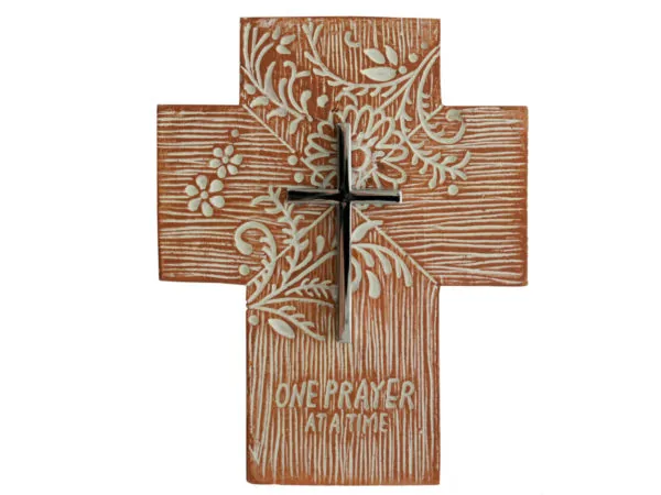 Enhance your living space with the Inspirational Terracotta Peace Plaque. This beautiful plaque features an engraved white saying, adorned with floral and heart decorations. A charming white ceramic dove adds a touch of serenity, complemented by a twisted metal wire hanger for easy display.
