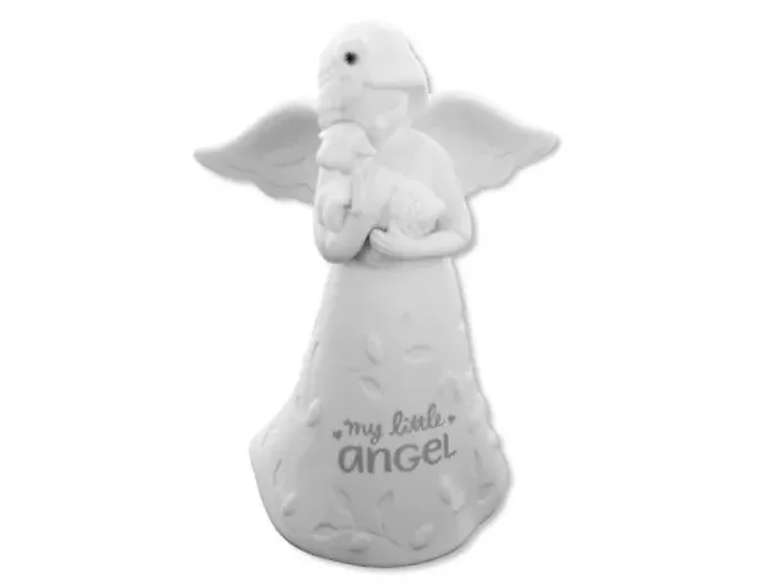 A delightful gift for young girls, the My Little Angel Porcelain Figurine showcases a charming ceramic angel cradling a baby lamb. This enchanting piece features glitter accents, shimmering wings, and a decorative jewel headband. It beautifully displays the phrase 'My Little Angel' surrounded by hearts at the bottom of her dress.