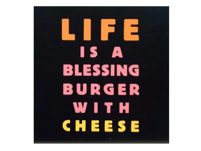 Transform your space with the delightful Blessing Burger Mini Box Print Wall Art. This charming piece features a black wooden box beautifully printed with the phrase "Life is a blessing burger with cheese" in vibrant orange, pink, and yellow colors. Designed for easy mounting, it includes a metal sawtooth hanger on the back, making it simple to display.