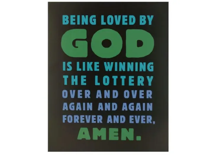 Enhance your living space with the Inspired by Faith Wall Art Box Print. This charming black wooden box showcases the uplifting phrase, "Being loved by God is like winning the lottery over and over again and again forever and ever, amen" in a delightful palette of light blue, soft green, and lavender. The art piece is designed for easy wall mounting with a metal sawtooth hanger on the back, making it a perfect addition to any room.