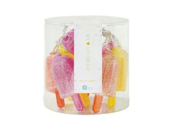Great for parties, patios and decorating anywhere, these Popsicle LED String Lights provide colorful, wireless accent lighting for indoor or outdoor spaces. Fun popsicle design is perfect for kids' parties and summer get-togethers. Ten long-lasting LED lights encased in transparent popsicle-shaped plastic shells are strung on a 4-foot cord with cordless battery operation. Requires 2 'AA' batteries (not included). Comes packaged in an individual box. Box measures approximately 6.75" x 2.75" x 9.5".