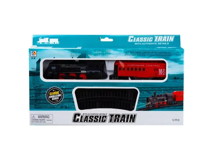 All aboard the fun! Our Battery Operated Light Up Train Set is perfect for young conductors ready to embark on a railway adventure. This charming set includes ten bendable tracks, one detailed locomotive, and one captivating carriage, totaling 12 pieces. Please note, batteries are not included. This classic train set is designed with authentic details and is beautifully packaged in a 14" x 8.50" x 1.65" hanging box, making it an ideal gift for train lovers.