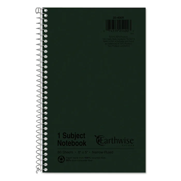 EARTHWISE BY 100% RECYCLED ONE-SUBJECT NOTEBOOK, 1 SUBJECT, NARROW RULE, GREEN COVER, 8 X 5, 80 SHEETS