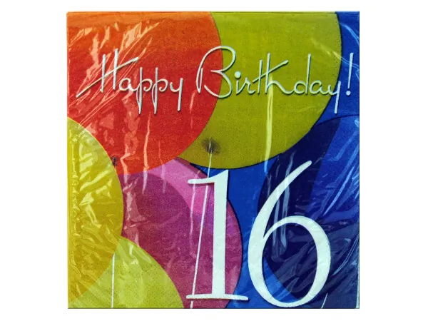 Celebrate this special milestone with our vibrant 16th Birthday Cake Celebration Napkins Set. This set includes 16 three-ply napkins, each measuring 12-7/8" x 12-3/4". The charming design showcases a festive 'Happy 16th Birthday!' greeting surrounded by a lively multi-colored background featuring balloons and confetti. On the reverse side, delight in a fun cake and star balloon motif. Perfect for any birthday table setting!
