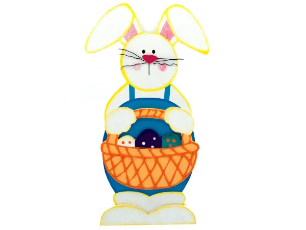 Introducing the Easter Bunny Themed Table Centerpiece Decoration, perfect for adding a festive touch to your holiday gatherings. This charming centerpiece measures 10" x 8.5" and features a delightful bunny head that easily assembles for a lively display. It includes a transparent cord for easy hanging or display on your table. Ideal for Easter brunch or family celebrations, this centerpiece comes packaged in a convenient poly bag with an attractive header card.