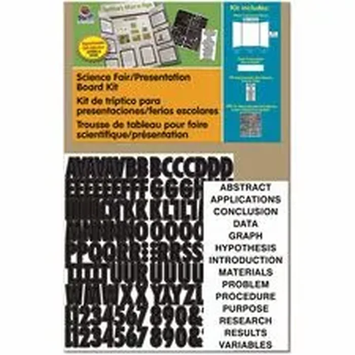 This convenient kit includes all the essential project materials needed for quickly creating a professional-looking display board. Kit includes one white corrugated, 48" x 36" presentation board; one white corrugated header; 143 self-adhesive and reusable black letters, numbers and symbols; and 14 self-adhesive science titles (Abstract, Applications, Conclusion, Data, Graph, Hypothesis, Introduction, Materials, Problem, Procedure, Purpose, Research, Results and Variables).