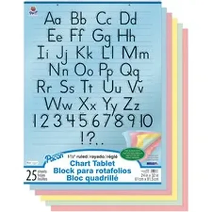 Traditional chart tablet contains 25 sheets of pastel-colored bond paper and a cover decorated with the alphabet in cursive. Each sheet is two-hole punched and offers 1-1/2" ruling in the short way. The stiff cover and paper are spiral-bound at the top. Assorted colors of pages include yellow, pink, salmon, blue and green.