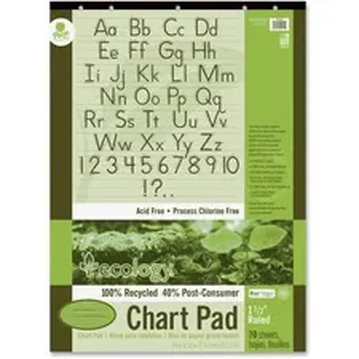 Eco-friendly chart pad is made using a high percentage of recycled material with post-consumer fiber. Acid-free pages are padded and taped to a heavy chipboard back for writing support. Sheets are 1-1/2" ruled with a 3/4" broken midline and 1/2" skip space. This pad is five-hole drilled to fit standard, chart stands and easels. Chart pad is processed chlorine-free and recyclable.
