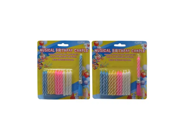 Add a festive touch to any birthday cake with this fun set. Set includes one musical candle base and three candles. Candle colors are white, blue and pink. Simply place one of the candles in the base, twist the candle and the base will play "Happy Birthday to You". Refill candles can be used over and over again in the base or they can be used on their own. Candles should be kept away from children.