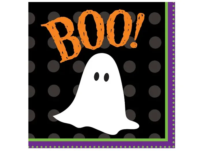 Celebrate Halloween in style with our Spooky Ghost Beverage Napkins. This 18-count set features 2-ply napkins measuring 9-4/5" x 9-3/4", perfect for adding a playful touch to your Halloween parties. Each napkin showcases an adorable white ghost along with the cheerful word "BOO!" set against a fun black polka dot background, complemented by a vibrant purple and green decorative border.