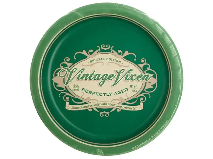 Celebrate in style with our Vintage Vixen Dessert Party Plates, perfect for any birthday bash! This set includes 8 durable, round cardboard plates featuring a quirky "Vintage Vixen" parody alcohol label design. Each plate measures approximately 6 7/8" in diameter and comes shrink wrapped for added convenience.