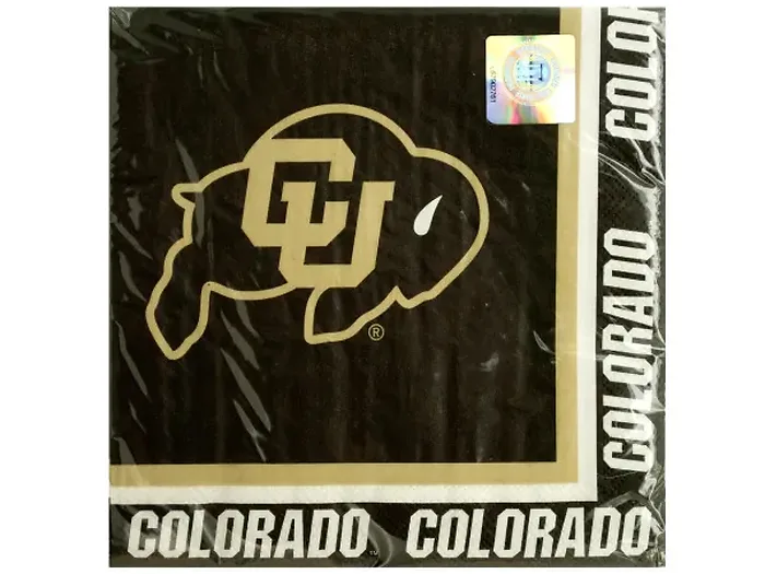 Bring school spirit to your celebrations with these collegiate licensed University of Colorado Lunch Napkins. This set includes 20 high-quality, 2-ply napkins featuring a stylish black, beige, and white design adorned with the iconic Buffaloes logo at the center.