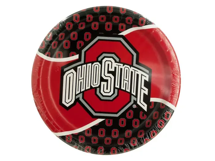 Celebrate in style with our officially licensed Ohio State University Party Plates Set. This set includes 8 durable round cardboard plates, each featuring a vibrant red, white, black, and grey design along with the iconic Ohio State University logo at the center. Perfect for game days, graduation parties, and any other gatherings celebrating OSU. Each plate measures approximately 8 3/4 inches in diameter and comes shrink wrapped for convenience.