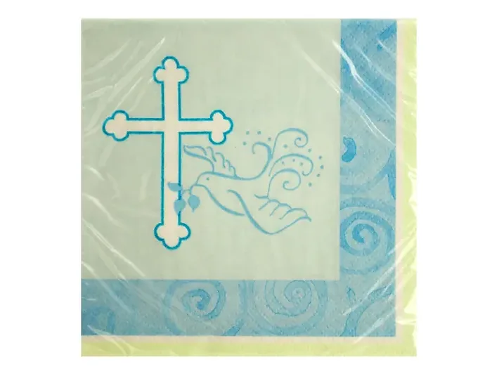Enhance your special occasions with our Elegant Blue Dove Celebration Napkins. This 16-piece set features beautifully designed 3-ply napkins adorned with a serene dove and cross motif against a calming light blue background, complemented by a blue swirl border and solid white and light green borders.