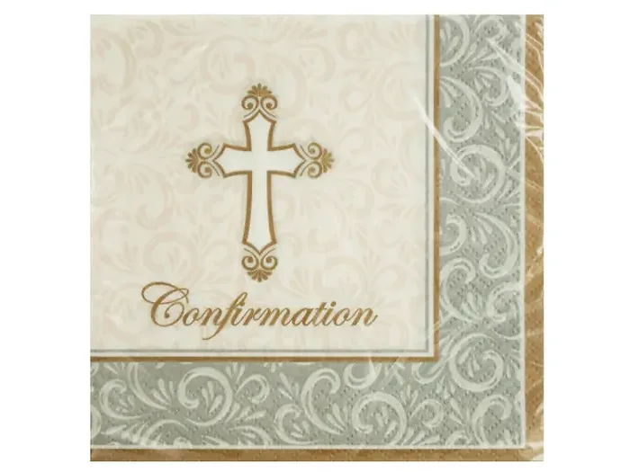 Celebrate the special occasion of Confirmation with our Elegant Confirmation Beverage Napkin Set. This set includes 16 premium 3-ply napkins, each adorned with a beautiful decorative cross and the word "Confirmation", all complemented by a stylish flourish pattern background. The napkins feature a sophisticated silver flourish border and a solid gold edge, making them perfect for any festive gathering.