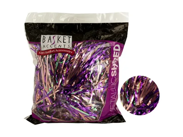 Add a touch of sparkle and style to your gift presentation with our Metallic Party Shred! This colorful mix features strips of shimmering pink and purple metallic plastic, perfect for filling gift baskets, bags, and even stuffed balloons. Each package contains 170 cubic inches of the festive shred, ensuring your gifts stand out on any occasion.