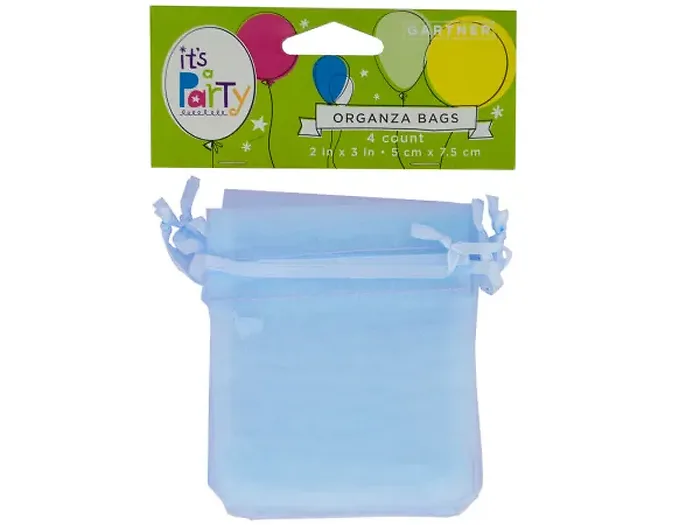 These exquisite sheer light blue organza bags are perfect for party favors, small gifts, and more. Each set includes 4 bags that are beautifully designed with elegant ribbon drawstring ties for secure closure. Measuring approximately 2" x 3", they are ideal for holding candies, trinkets, or small keepsakes. Each bag comes neatly packaged in a poly bag with a header card, making them a delightful addition to any celebration.