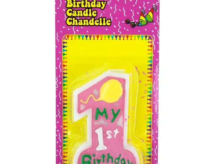 This delightful Pink 1st Birthday Candle is the perfect addition to any girl's first birthday celebration. Designed to capture the joy of this special occasion, the candle is shaped like the number one and is adorned with raised lettering that reads 'My 1st Birthday' along with a charming balloon illustration.