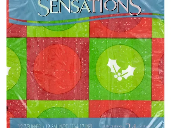 Add a festive touch to your holiday gatherings with the Jolly Holly Check Holiday Luncheon Napkins. This set of 24 napkins features two charming designs: one side showcases vibrant red and green checkers adorned with holly leaves, while the reverse side displays classic red, white, and green stripes. Each napkin measures approximately 12 7/8" x 12 3/4" and comes conveniently shrink-wrapped for easy storage and presentation.