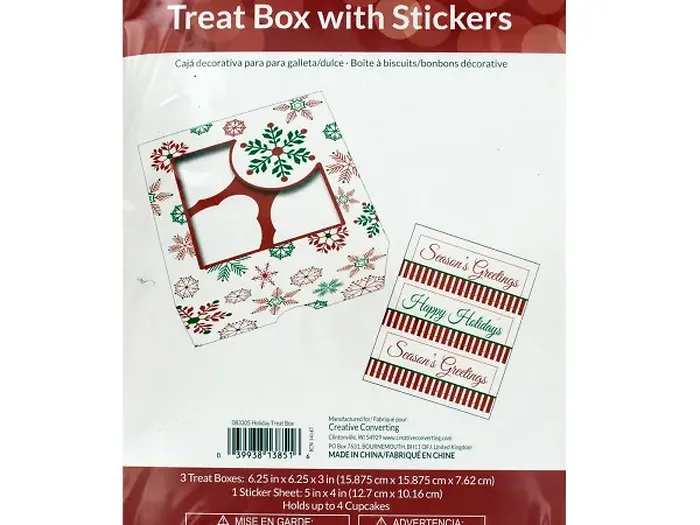 Included is a sticker sheet featuring festive phrases to add a personal touch to your gifts or party favors. Each box measures approximately 6.25 inches by 6.25 inches by 3 inches, while the sticker sheet is sized at 5 inches by 4 inches. Ideal for ages 3 and up. Packaged in a convenient poly bag with a header card for easy storage and gifting.