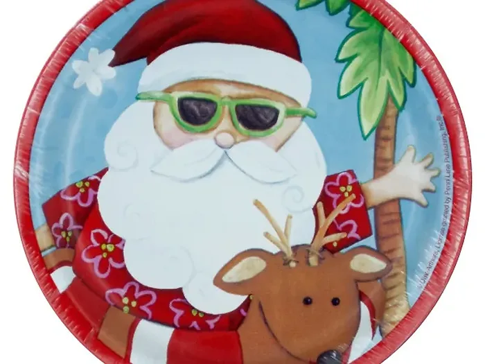 Celebrate the festive season with our Santa's Holiday Party Plates Set. Featuring colorful round plates adorned with a jolly Santa Claus in sunglasses next to a cheerful palm tree, these plates are perfect for any holiday party. Each plate measures approximately 6 7/8 inches in diameter and comes shrink wrapped for easy storage.