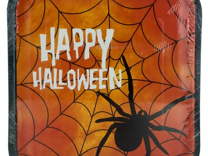 Set the perfect table for your Halloween festivities with our Halloween Spider Web Party Plates. This 8-piece set features vibrant orange and black square plates adorned with a creepy spider on its web, along with the spooky greeting 'Happy Halloween' in crisp white lettering.