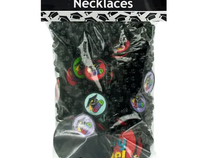 Celebrate the momentous occasion of graduation with our Graduation Celebration Beaded Necklaces Set! This set includes 12 vibrant necklaces featuring black plastic beads adorned with colorful "Grad" disc beads and large "Party Time" medallions depicting graduation caps. Each necklace measures approximately 33" in length, making them a perfect accessory for graduates and guests alike.
