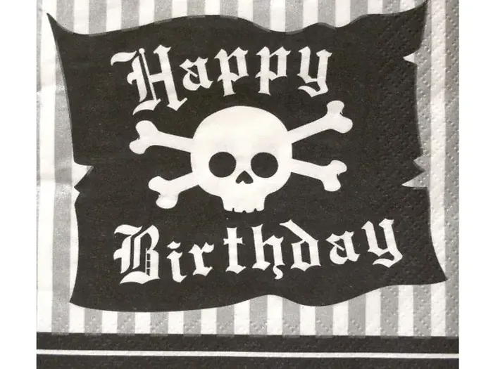 Celebrate your birthday in style with these delightful beverage napkins! This 16-piece set of Happy Birthday Pirate Flag Beverage Napkins features a fun and festive pirate flag design with the phrase "Happy Birthday" set against a playful striped background.