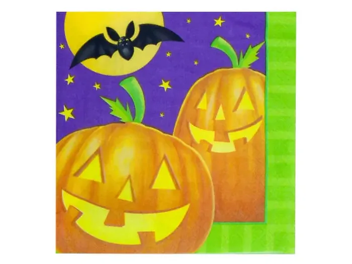 Add a festive touch to your Halloween gatherings with the Spooky Pumpkin Lunch Napkins Set. This set includes 16 high-quality, 2-ply napkins decorated with vibrant, playful jack-o'-lanterns that seem to glow against a charming starry night backdrop. Complete with a whimsical bat and full moon design, these napkins are perfect for creating a spirited atmosphere at your holiday celebrations. Each napkin measures approximately 12 7/8" x 12 3/4" and comes neatly packaged in a poly bag.