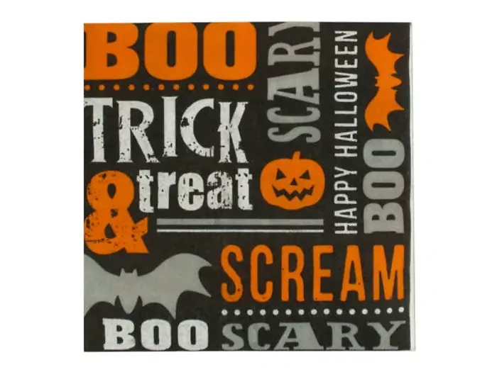 Add a festive touch to your Halloween gathering with our 16-count Trick & Treat Lunch Napkins. These 2-ply napkins bring fun and charm with their whimsical design, featuring Halloween-themed words, bats, and pumpkins.
