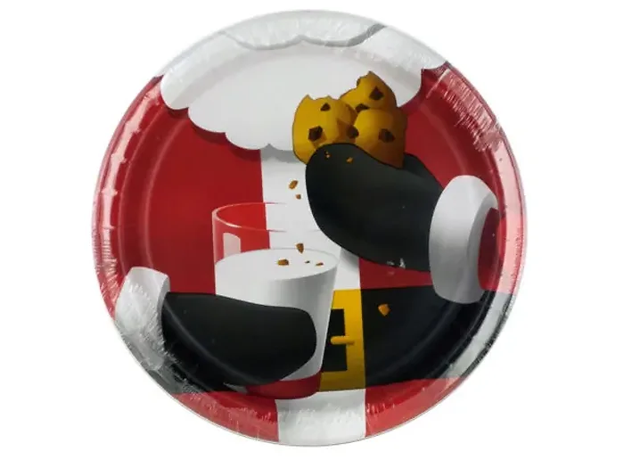 Bring joy to your holiday gatherings with the Festive Santa Scenes Party Plates Set. This 8-piece set features sturdy, coated paper plates, each adorned with a delightful print of Santa enjoying a cookie and holding a glass of milk. Designed with a recessed shape, these plates are easy to hold and help prevent spills during your festive celebrations. Each plate measures approximately 8-3/4" in diameter and comes shrink-wrapped for easy storage.