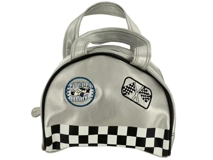 Elevate your style with the Sporty Metallic Silver Handbag. This unique accessory is crafted from soft metallic silver vegan leather, adorned with vibrant embroidered race flags and race car patches. The design features a chic black and white checkered pattern at the bottom, complemented by sleek black piping.