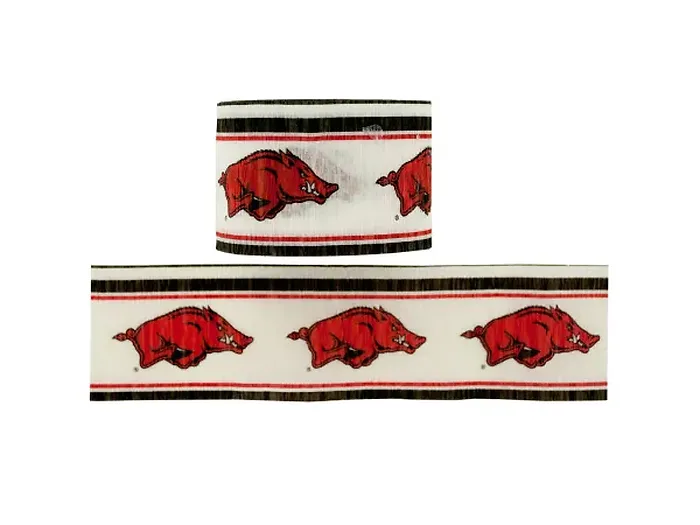 Featuring the iconic Razorbacks logo, it boasts bold red and black stripes against a durable white backdrop. This streamer is not only visually appealing but also flame resistant and bleed resistant, making it a safe choice for indoor and outdoor festivities.