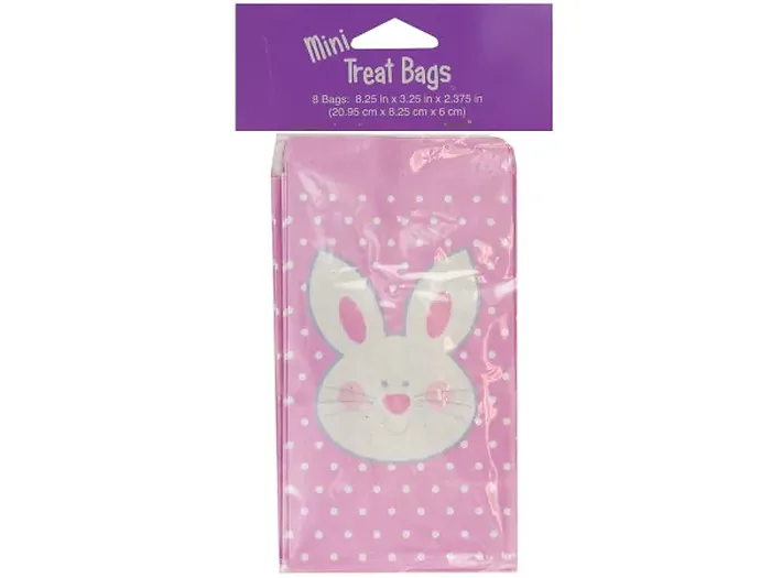 Celebrate Easter in style with our Adorable Mini Bunny Treat Bags, perfect for parties and gatherings! This set includes 8 charming pink paper bags adorned with white polka dots and a cute bunny face featuring glitter on both sides. Each bag measures 8.25" x 3.25" x 2.375", making them ideal for holding treats, candies, or small gifts. Packaged conveniently in a poly bag with a header card, these treat bags will add a festive touch to your Easter celebrations.