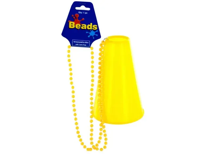 Add some excitement to your next event with our Vibrant Yellow Beaded Necklace and Megaphone Set! Ideal for parties, sports events, and cheerleading, this colorful accessory will make you stand out. The necklace is made of durable plastic beads and measures approximately 17 inches long. It comes with a matching novelty megaphone, measuring 5.75 x 3.75 inches, perfect for making some noise at your favorite events. Recommended for ages 3 and up, this set is sure to be a hit!