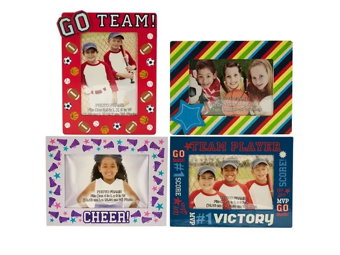 Showcase your favorite sports moments with the Athletic Memories Photo Frame! This creatively designed frame features a composite wood or covered cardboard construction adorned with vibrant sports prints. It includes a sturdy table stand for convenient display. Available in assorted styles, this frame adds a playful touch to any room.