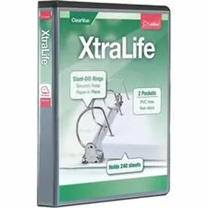 View binder features a unique XtraLife material that will not stick to cover title insert or materials stored inside, including photos, laser prints and photocopies. Material is much stronger than standard vinyl so no seam splitting and hinge tearing. Unique, polyolefin cover material is better for the environment when produced and disposed than vinyl. Nonstick cover offers a clear, nonglare overlay on three-sides for easy customization. Designed to endure extreme temperatures, this binder is cold-crack tested to negative 50 degrees Fahrenheit. Locking Slant-D rings hold 25 percent more letter-size material than standard round rings while GelTab triggers make it comfortable to operate. Back-mounted steel rings provide a clean, professional spine and reduce wear. 1" ring capacity holds approximately 270 sheets. Horizontal pockets on the inside front and back covers hold loose papers. Each pocket holds 40 sheets. Binder also features a sturdy chipboard core and exposed rivets.