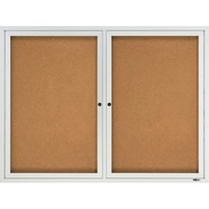 Enclosed outdoor bulletin board offers a self-healing cork surface and high-density backing for maximum pin-holding power, ensuring documents stay securely posted. Two locking, water-resistant, shatterproof acrylic glass doors and aluminum-vented casing allow posting, protecting and easily updating important messages. Satin-finish anodized aluminum frame offers full-length hinges and weather-resistant durability. Bulletin board includes one key per lock.