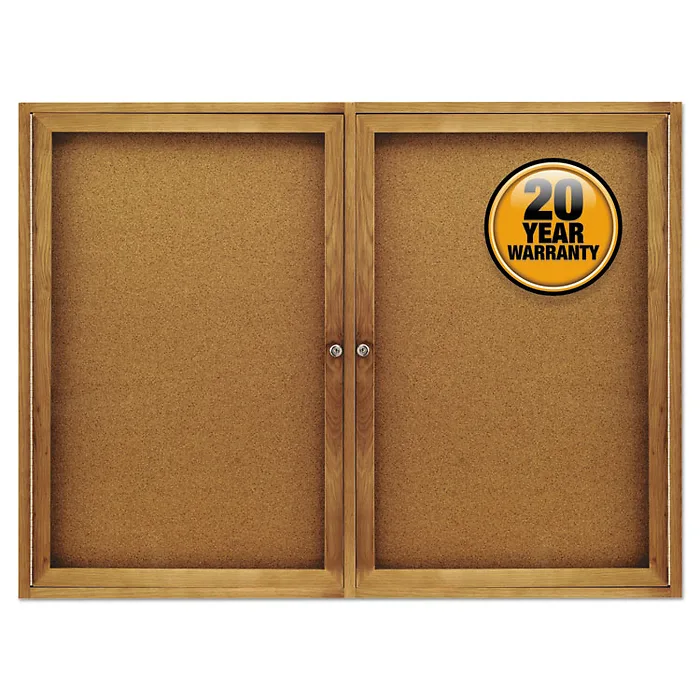 Enclosed, cork bulletin board delivers quality performance when communication is needed in any indoor environment. Three locking, shatterproof acrylic doors allow posting, protecting and easily updating important messages. Highly durable, enclosed natural-cork bulletin board is backed by high-density fiberboard. Self-healing surface and high-density backing deliver maximum pin-holding power, ensuring documents stay securely posted. Satin finish, anodized aluminum frame with full-length hinges complements any interior. Indoor bulletin board includes one key per lock. Hanging devices are factory-installed. Specially designed, security lock system secures board to wall.
