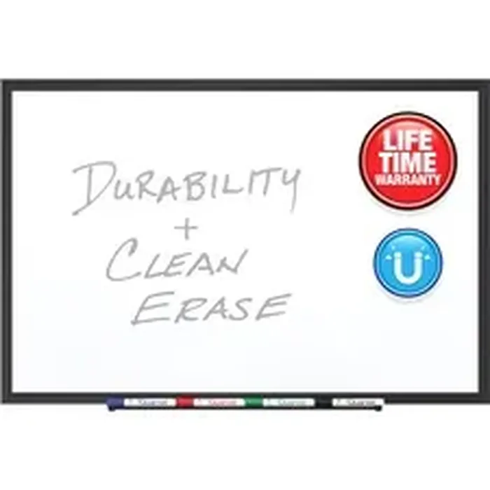 Durable, porcelain board outlasts other whiteboards. Able to withstand heavy use and perform well with only minimal cleaning required, the ultra-smooth, magnetic, dry-erase surface will not ghost, stain, scratch or dent. Strong magnetic quality holds papers on board surface securely with magnets. This board is the ideal choice in a busy conference room or other shared work space that is home to frequent collaboration. When you need to work hard, a porcelain board is the only one that can keep up. The black finish on the aluminum frame matches most decor. Whiteboard also features a black, aluminum frame and comes with mounting hardware and four Quartet dry-erase markers with chisel tips. Attached marker tray provides convenient storage for accessories.
