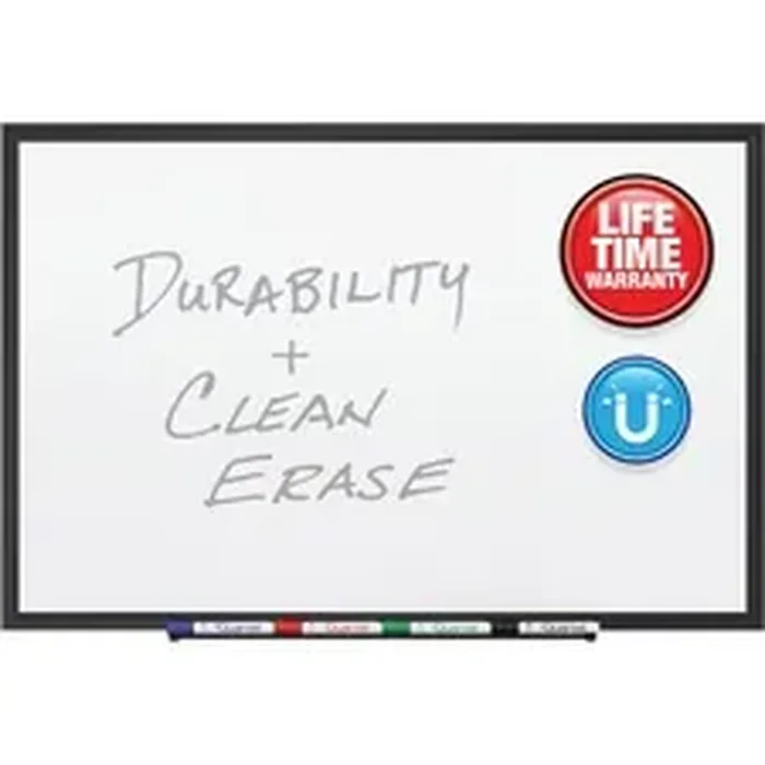 Durable, porcelain board outlasts other whiteboards. Able to withstand heavy use and perform well with only minimal cleaning required, the ultra-smooth, magnetic, dry-erase surface will not ghost, stain, scratch or dent. Strong magnetic quality holds papers on board surface securely with magnets. This board is the ideal choice in a busy conference room or other shared work space that is home to frequent collaboration. When you need to work hard, a porcelain board is the only one that can keep up. The black finish on the aluminum frame matches most decor. Whiteboard also features a black, aluminum frame and comes with mounting hardware and four Quartet dry-erase markers with chisel tips. Attached marker tray provides convenient storage for accessories.