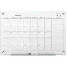 Glass calendar board provides long-term durability for your monthly planning with a modern aesthetic appeal. Frameless board design blends seamlessly into any environment. Reuse month after month to keep track of your schedule all year long. Monthly format offers daily blocks and a ruled column for notes. Tempered glass surface will not stain, ghost, scratch or dent despite heavy use. The magnetic feature allows instant hanging of documents and notes. Dry-erase marker glides evenly over the board surface for smooth writing. Nonabsorbent glass is easy to keep clean with Quartet whiteboard cleaning supplies. Board includes one Quartet dry-erase marker and two rare-earth, high-power magnets.