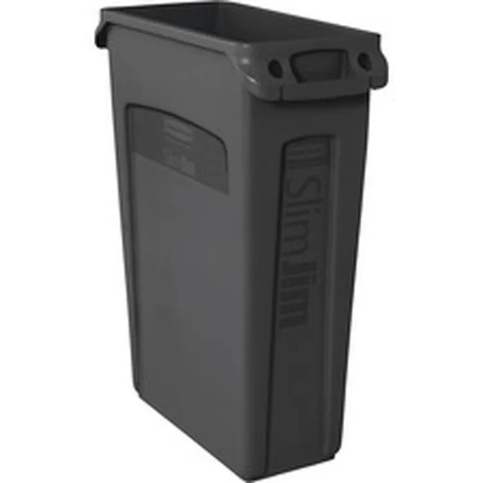 This Slim Jim container delivers the durability needed for commercial environments combined with innovation to increase worker productivity. Four venting channels make removing liners up to 80 percent easier than traditional containers so the Slim Jim helps you get the job done more efficiently. They improve productivity and reduce the risk of worker injury. Integrated cinches allow quick, knot-free liner changes. Space-saving profile fits virtually anywhere. Side handles make handling easy. Slim Jim accessories, such as recycling tops, swing lid, hinge lid and dolly (sold separately), bring you an efficient solution for collection, transportation and disposal of multi-stream waste and recyclables in tight spaces.
