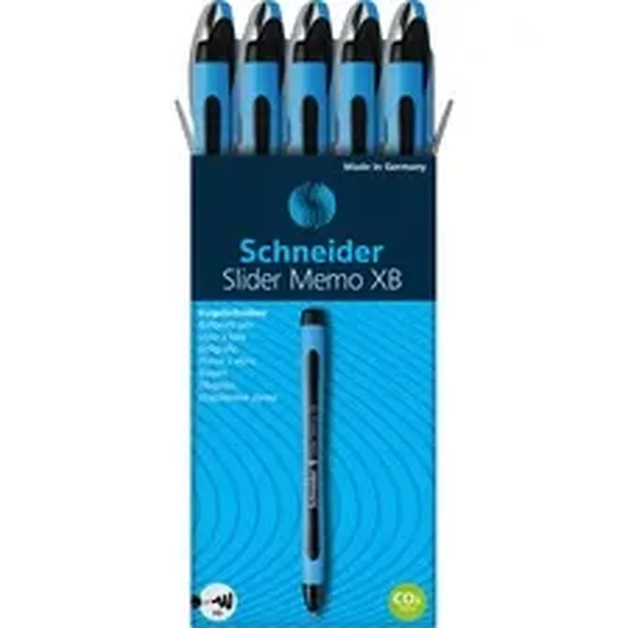 General InformationManufacturer:Schneider Schreibgerte GmbH Manufacturer Part Number:150201 Manufacturer Website Address:http://www.schneiderpen.com Brand Name:Schneider Product Line:Slider Memo Product Name:Slider Memo XB Ballpoint Pen Marketing Information:Slider Memo XB Ballpoint Pen features Viscoglide technology for extraordinarily smooth-gliding writing performance. Waterproof ink produces an extra-broad line width for increased visibility and suitability for documentary use. Wear-resistant, stainless steel tip ensures that the large ink supply can be fully used. Ink dries quickly to prevent smearing and is smudge-proof when highlighting it later. Ergonomically shaped, generously rubberized barrel promotes tireless and relaxed writing without hand fatigue. Cap has a sturdy metal clip and fits neatly on either end of the pen. Ballpoint pen is produced with a carbon-neutral process and certified by ClimatePartner. Packaged Quantity:10 / Pack Product Type:Ballpoint Pen