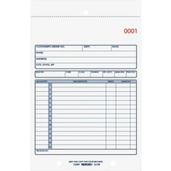 Carbonless, sales book forms offer a simple format to record information with space for customer's information (name and address), date, seller, method of payment and items with their quantity, description and cost. Two other boxes offer a place for the customer's order number and recipient of the merchandise. Carbon coating on back of each original transfers writing to copies. Two-part forms are consecutively numbered and come in a manifold book with a flexible cover. Paper sequence is originals in white and duplicates in yellow.
