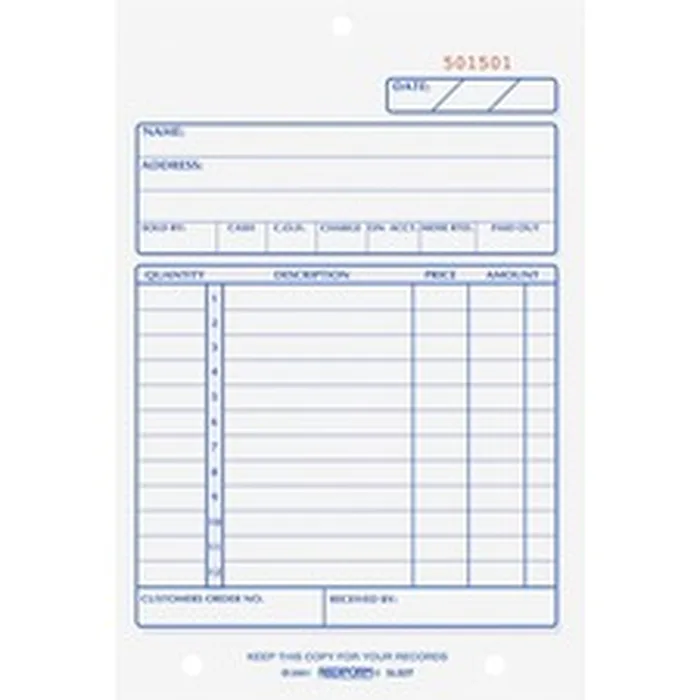Carbonless, sales forms offer a simple format to record information with space for customer's information (name and address), date, seller, method of payment and up to 12 items with their quantity, description and cost. Two other boxes offer a place for the customer's order number and recipient of the merchandise. Special design transfers writing from the original to the two copies. Two-part forms are consecutively numbered and come in a manifold book with a flexible cover. Paper sequence is originals in white and duplicates in yellow.